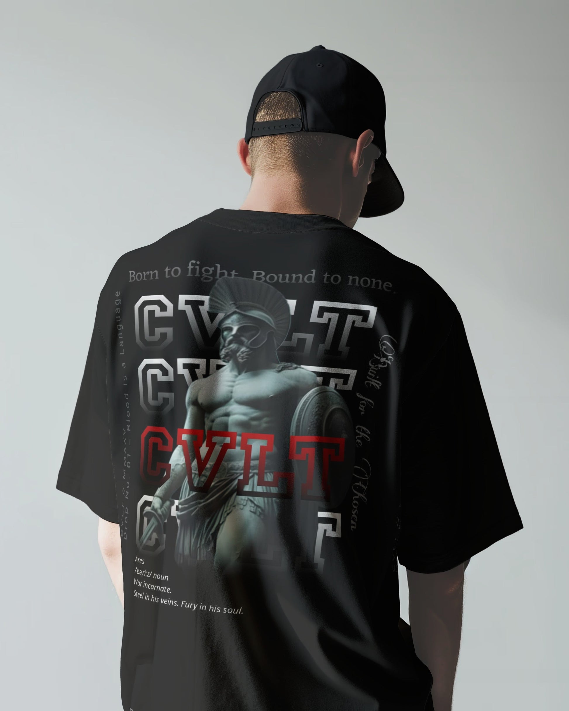 Back Graphic: Ares crowned in the curse of war, emerging through the CVLT insignia