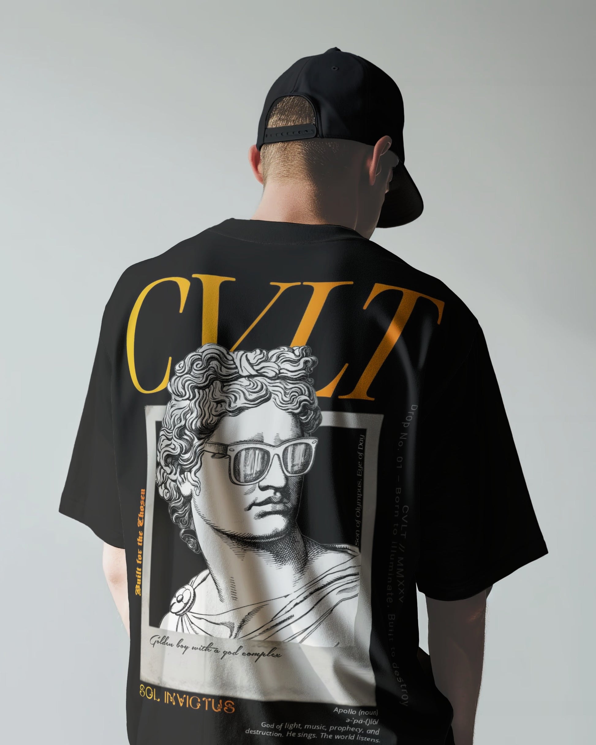 Back Graphic: Apollo in motion, bursting through sun-flared CVLT insignia